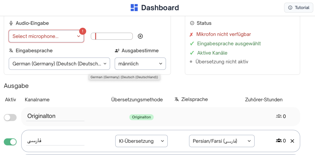 Wir freuen uns sehr, dass das jetzt möglich ist. Eine spezielle Software namens STREAMLINGO macht es möglich, den Ton vom Sprechermikrofon direkt auf die Website von Streamlingo zu übertragen, wo die Übersetzung stattfindet. Die Zuhörer im Saal scannen einen QR-Code mit dem Smartphone und hören den übersetzen Text übers Handy per Kopfhörer mit. Ein erster Testlauf ergab, dass die KI ihre Sache ziemlich gut gemacht hat.